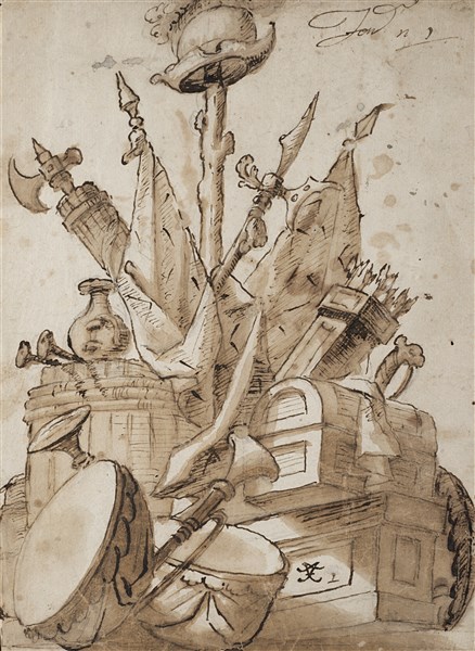 Scuola veneta del secolo XVIII Trofei Penna, inchiostro bruno, acquerellato in