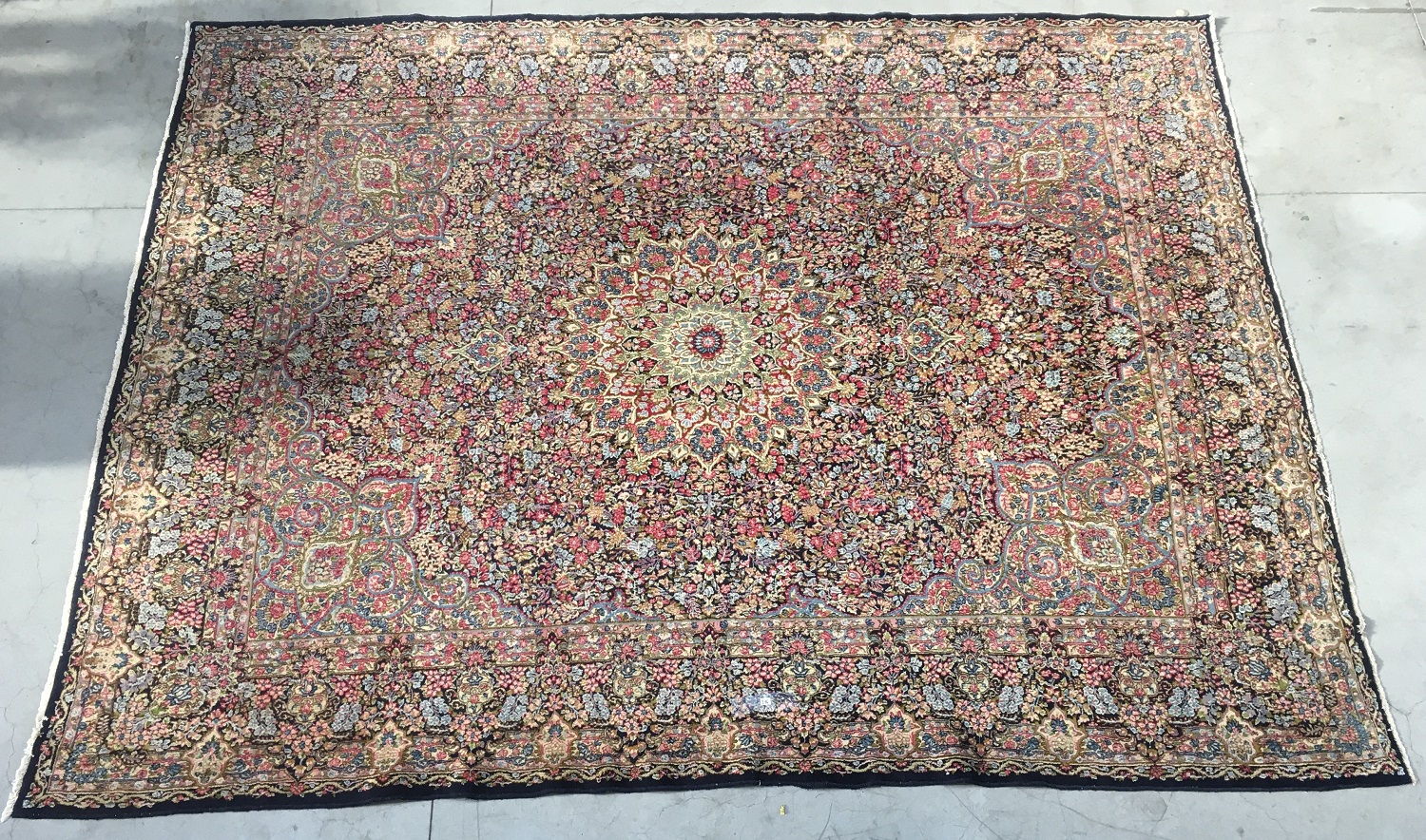 Tappeto Kirman Millefleur, Persia, secolo XX. Decoro a medaglione polilobato su campo fiorito (cm 357x268) (difetti)