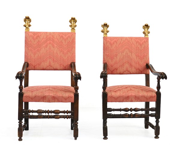 Coppia di seggioloni in noce con puntali intagliati e dorati, braccioli mossi, gambe squadrate riunite da traverse tornite (difetti)