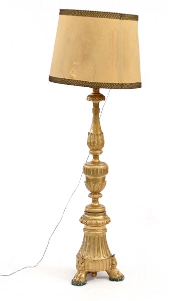 Portacero in legno scolpito, intagliato e dorato a foglie d'acanto, scanalature e piedi ferini. Secolo XIX (h. cm 146) (difetti)