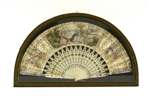 Ventaglio con stecche in avorio e pagine in carta decorate a scene galanti. Secolo XIX, contenuto in teca in velluto (difetti)
