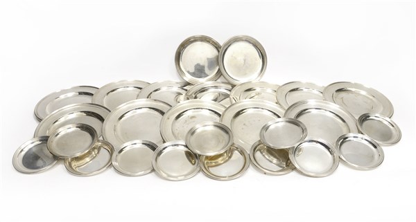 Servizio da tavola composto da dodici piattini da pane, dodici sottobicchieri e due sottobottiglie in argento liscio con bordo scanalato. Marchi Gabrielli, Milano (g 2700 ca.)