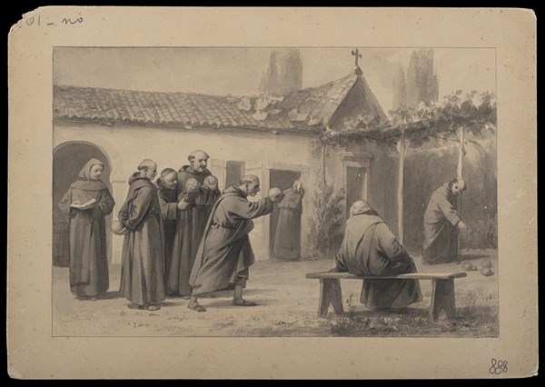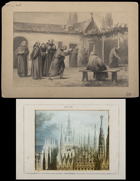 Lotto composto da un disegno e un'incisione: Scuola del secolo XX Frati che gi