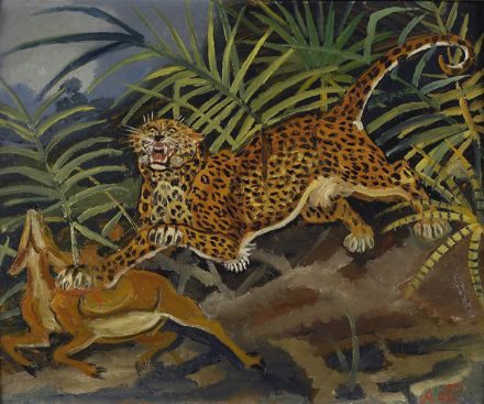 Antonio Ligabue (Zurigo, 1899 - Gualtieri, 1965) Leopardo con gazzella, (1954-55) Olio su faesite, cm. 40x49 In basso a destra: "A.L.". Sul verso, a pennarello: "E' opera autentica di/Antonio Ligabue/in fede/Sergio Negri". Autentica di Sergio Negri su foto. Provenienza: Guastalla, Collezione A. Tota. Bibliografia: Cesare Zavattini, C. Zavattini, FMR, Milano, 1967, (segnalata come opera non riprodotta, pag. 176); Sergio Negri, "Antonio Ligabue", Catalogo Generale dei Dipinti, Electa, Milano, 2002, p. 219, n. 98.