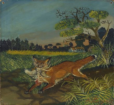 Antonio Ligabue (Zurigo, 1899 - Gualtieri, 1965) Volpe con pollo in bocca, (1957-58) Olio su faesite, cm. 40x44 In basso a destra: "A.Ligabue". Sul verso, a pennarello: "E' opera autentica di/Antonio Ligabue fa parte/del III° periodo/in fede/Sergio Negri/Guastalla 17.1.81". Autentica di Sergio Negri su foto. Provenienza:Milano, collezione privata.. Bibliografia: Sergio Negri, "Antonio Ligabue", Catalogo Generale dei Dipinti, Electa, Milano, 2002, p. 219, n. 98.