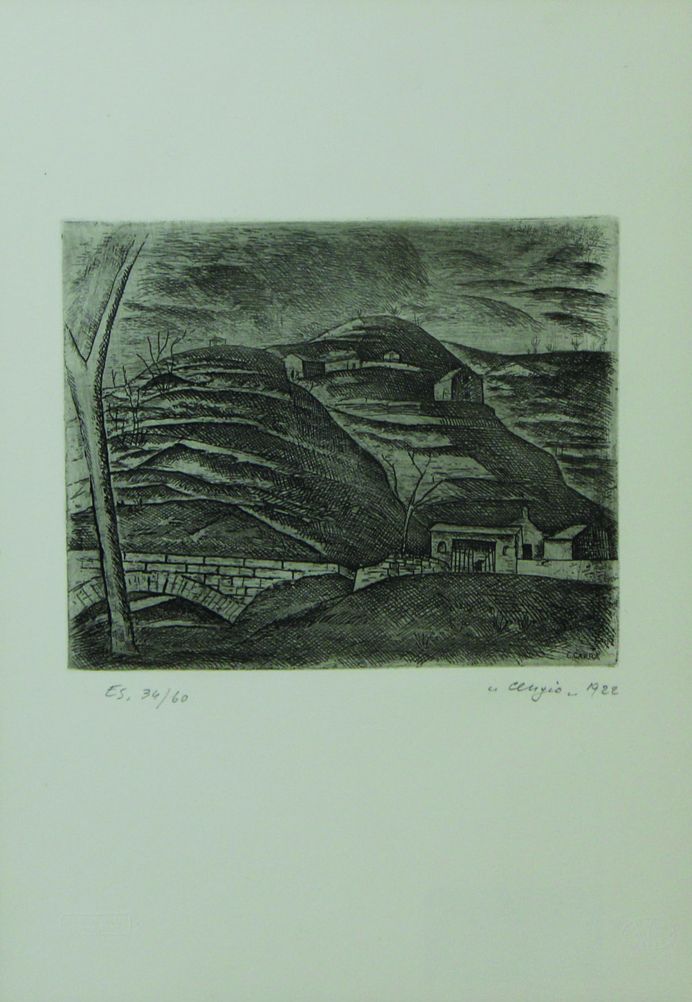 Carrà Carlo Cengio, 1922 acquaforte su carta cm 50x35 es. 34/60, timbro a secco Luigi De Tullio Stampatore, al retro autentica di Massimo Carrà