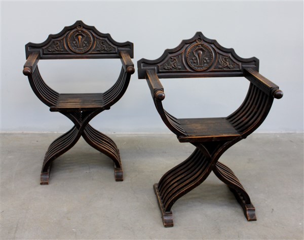 Coppia di poltroncine savonarola con schinale sagomato e intagliato (difetti)