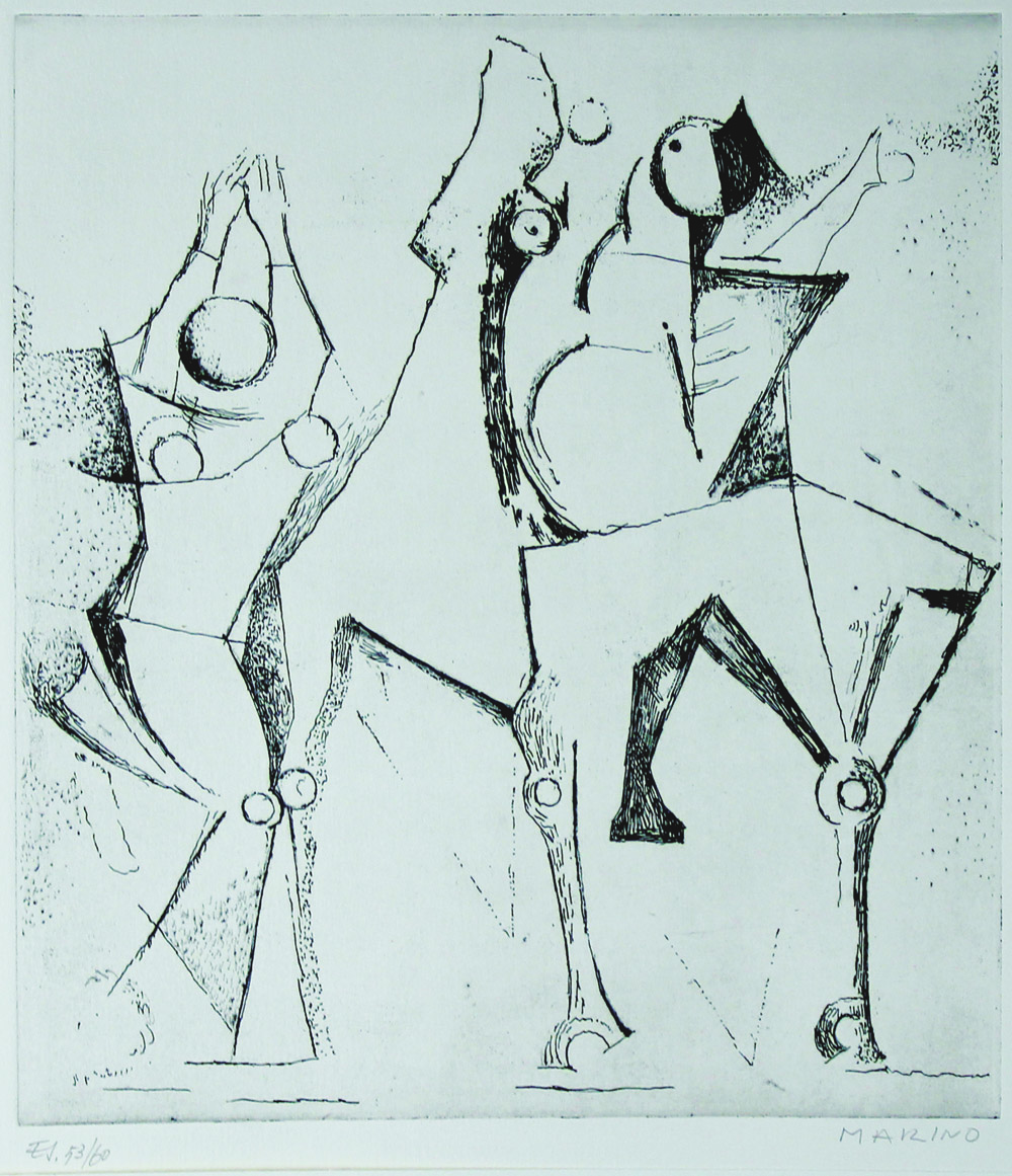 Marini Marino Trio felice, 1970 Acquaforte - punta rotante cm 70x50 es. 53/60, firmata in basso a destra, pubblicata su Catalogo Generale Opera Grafica di Marino A 119, timbro a secco Luigi De Tullio Stampatore