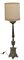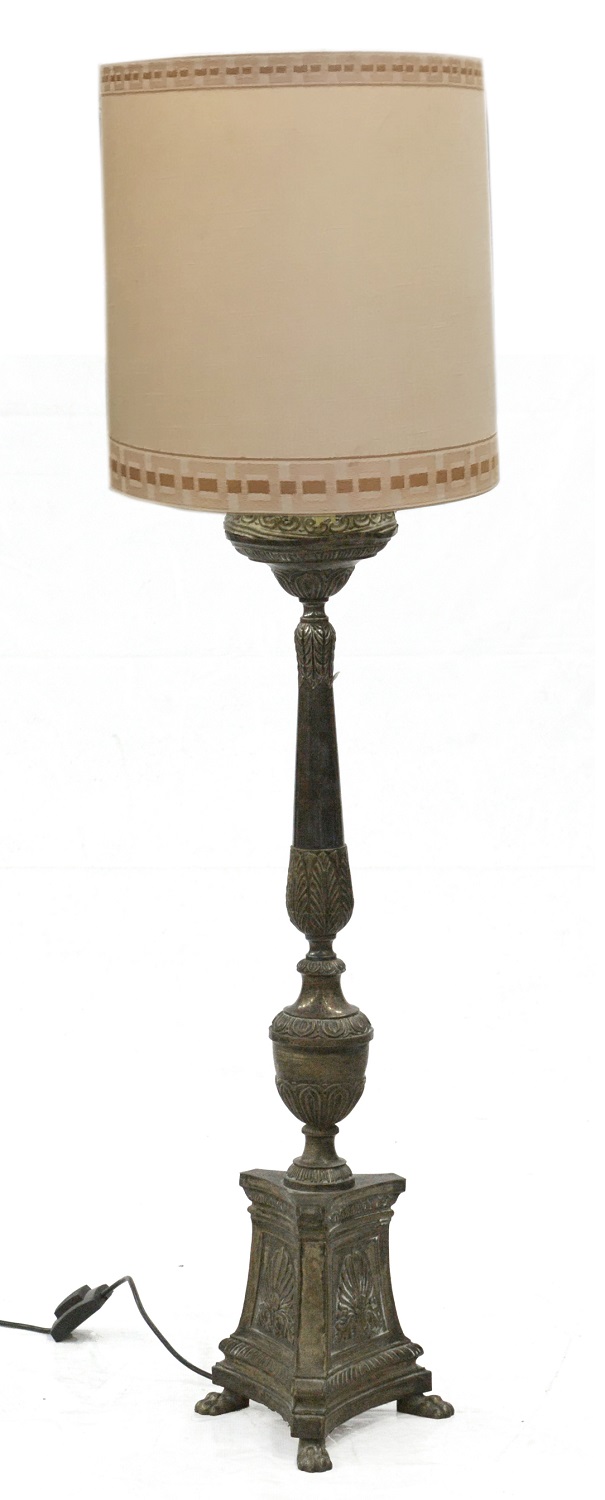 Portacero tripode in metallo argentato con decoro a motivi fogliacei, montato a luce elettrica. Paralume in stoffa (h cm 105) (difetti)