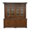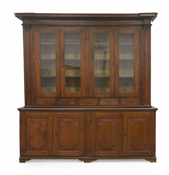 Antica libreria a due corpi con parte inferiore a quattro sportelli pannellati, parte superiore con cinque cassetti e quattro sportelli a vetri (cm 241x255x40) (difetti e restauri)