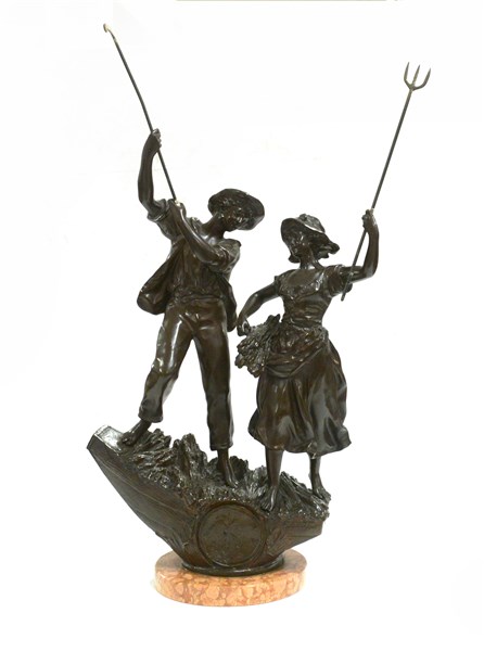 Ignoto "Contadini" gruppo in bronzo (h cm 84) su base tonda in marmo rosso venato (difetti)