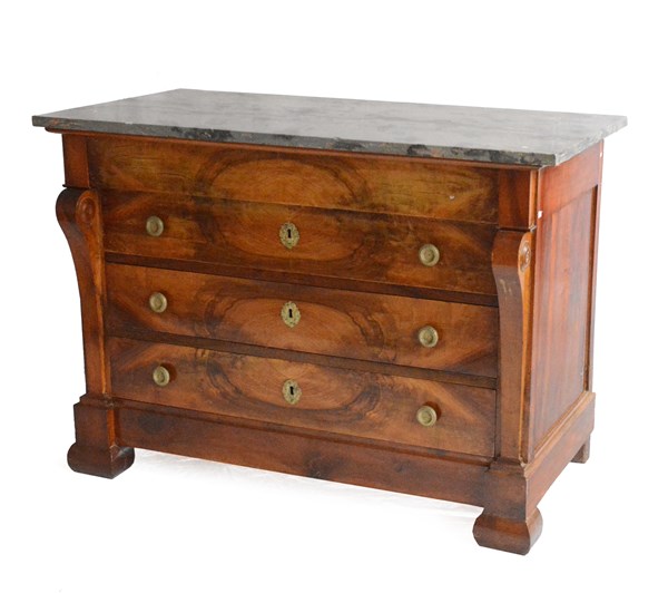 Comò a quattro cassetti lastronati in piuma, montanti sagomati, piedi squadrati. Piano in marmo. Secolo XIX (cm 133,5x96x63) (difetti e restauri)