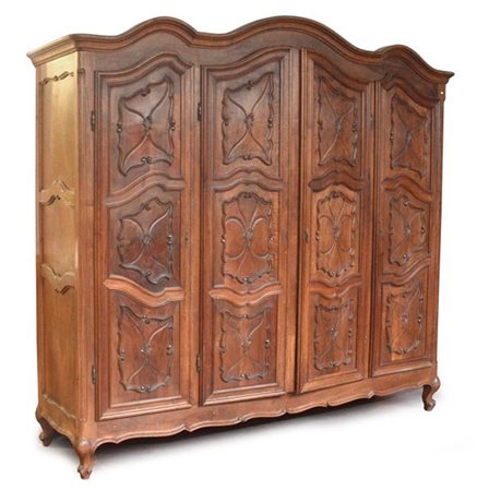 Armadio in legno di forma mossa a quattro ante pannellate intagliate a ragnatela (cm 234x224x61) (difetti)