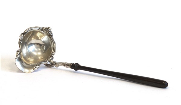 Mestolo in argento con bordo sbalzato a volute fogliate, ansa in legno tornito. Marchi non decifrati del secolo XIX (lievi difetti)