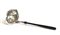 Mestolo in argento con bordo sbalzato a volute fogliate, ansa in legno tornito.