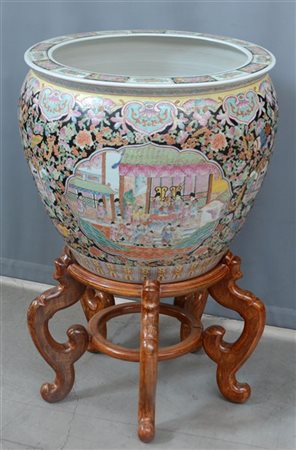 Grande vasca per pesci in porcellana policroma decorata con figure e motivi floreali, base in legno. Cina, secolo XX (d. cm 52) (lievi difetti)