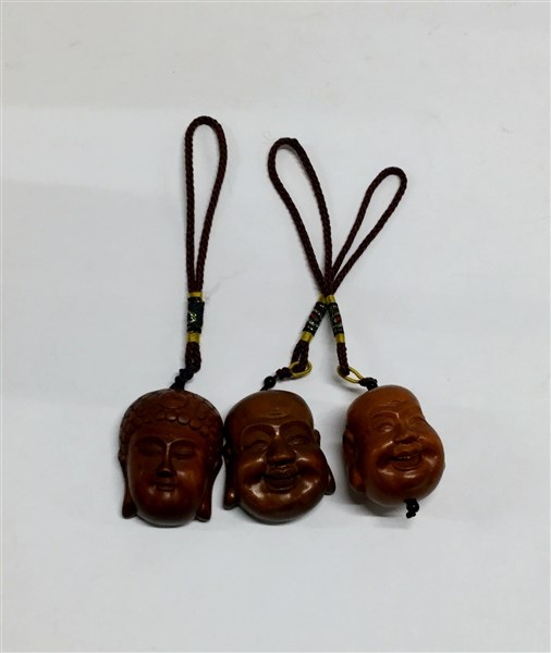 Arte giapponese. Gruppo di tre maschere in legno intagliato raffigurante volti di Buddha (lievi difetti)