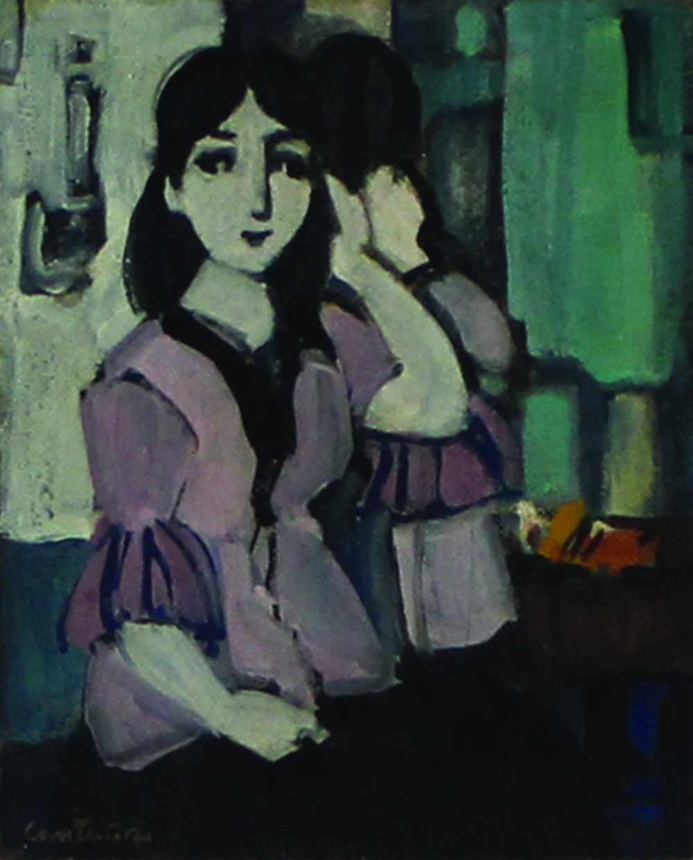 Cantatore Domenico Figura, 1956 olio su masonite cm 30x25 firmato in basso a sinistra, firmato per autentica e datato al retro, etichetta Farsetti arte al retro, autentica dell'artista su foto 21.05.86