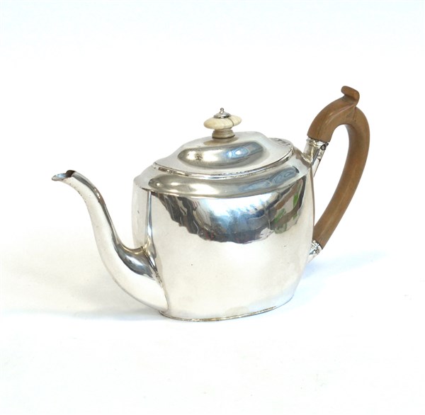 Teiera a corpo liscio in argento con prese del coperchio in avorio e ansa sagom
