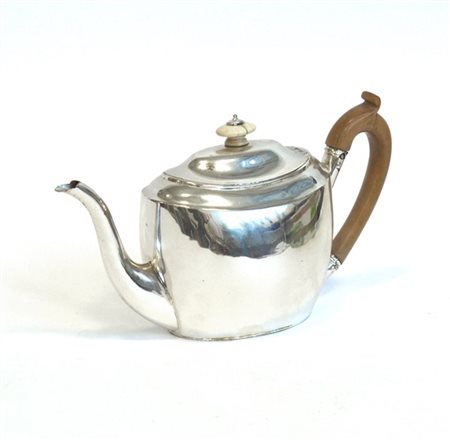 Teiera a corpo liscio in argento con prese del coperchio in avorio e ansa sagomata in legno (g lordi 450 ca.) (lievi difetti)