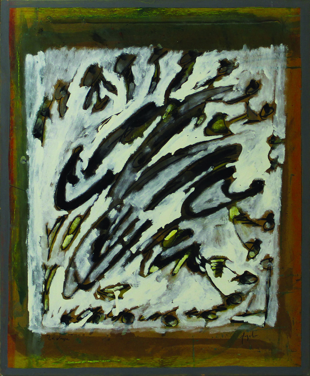 Dangelo Sergio Le vespe smalto e tempera su tavola cm 72x60 firmato in basso a destra, intitolato in basso a sinistra, pubblicato a pagina 16 del catalogo Skira "Sergio Dangelo, Altrove e colti al volo". Firma per autentica su pagina del catalogo