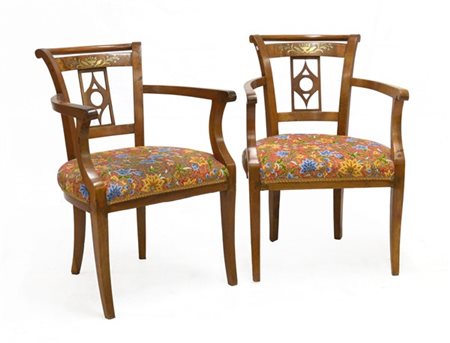 Coppia di poltrone con schienale e bracciali mossi, fascia intarsiata a volatil