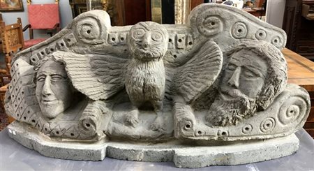 Antico altorilievo in pietra di forma mossa, un lato contrato da gufo e volti,