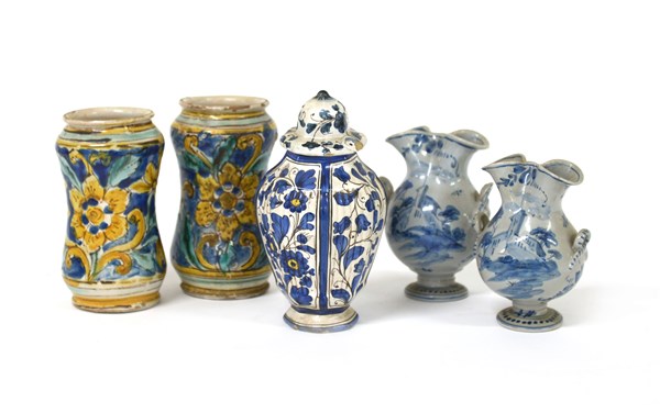 Manifatture diverse Lotto composto da due albarelli, due vasetti biansati ed un