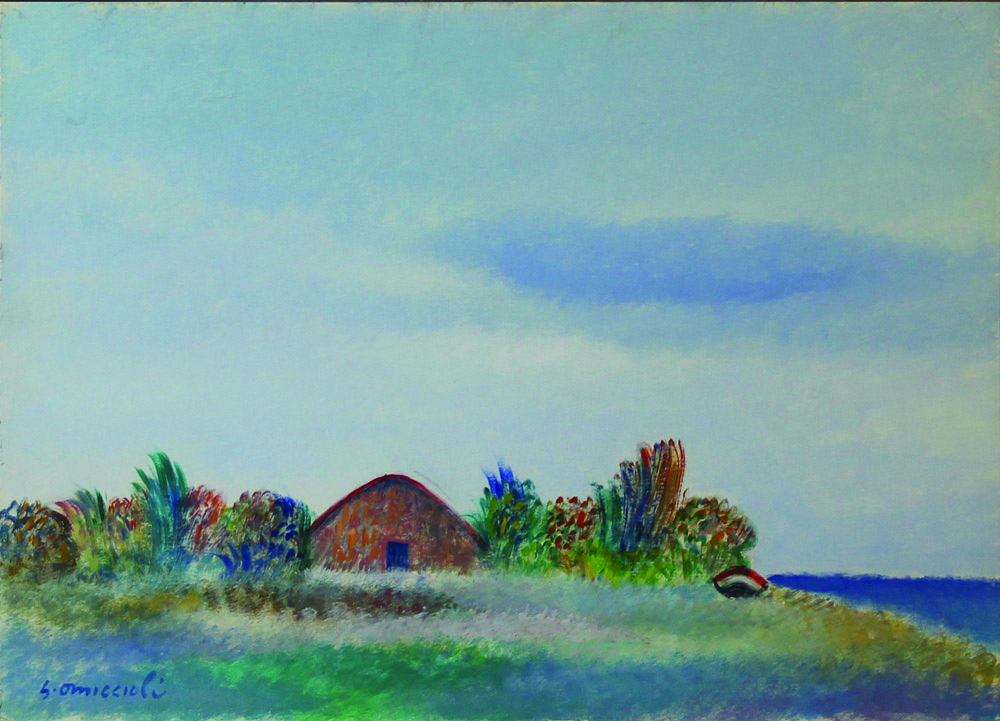 Omiccioli Giovanni Capanno e barca a Fregene olio su cartone cm 35x50 firmato in basso a sinistra, autentica dell'artista al retro