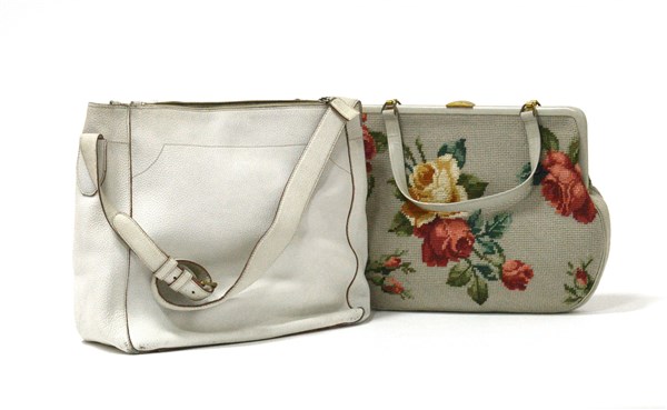 Lotto composto da una borsa ricamata a punto croce con motivi floreali e una borsa a tracolla in pelle bianca (gravi difetti)