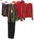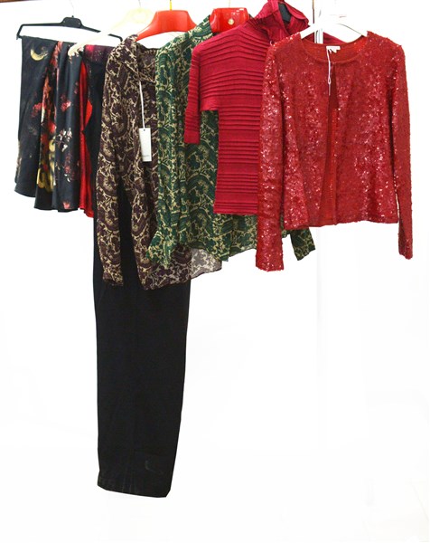 Lotto composto da due camicie fantasia una sabbia e prugna e l'altra sabbia e verde, giacchino leggero rosso tutto rivestito in paillettes, camicetta color rubino elasticizzata a collo alto con manica corta, abito a spalline lungo nero e due gonne fantasia di diversa lunghezza in seta sui toni del nero rosso e oro (tg. 40/42)