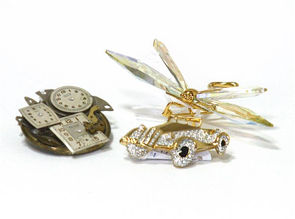 Lotto composto da tre spille,una a guisa di libellula in argento 925 dorato e ali in cristallo, una a forma di macchinina con strass e smalto nero questa in metallo dorato l'ultima in metallo con tre diversi quadranti per orologio con firma illeggibile sul retro