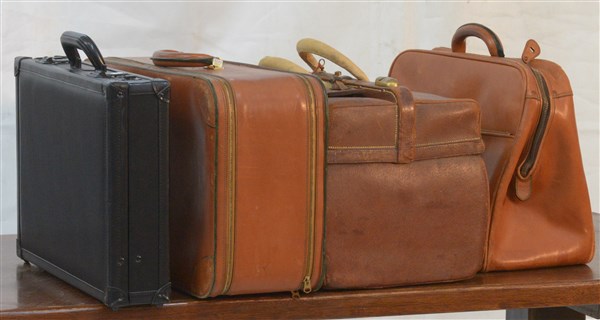 Lotto composto da un borsone/necessaire da viaggio in cinghiale con stemma e iniziale di S.M. Amelia del Portogallo completo di boccette, pettini spazzole etc, unito a un borsone da viaggio, una valigia in cuoio e una borsa da lavoro (difetti e mancanze)