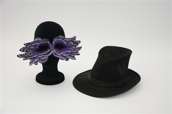 Lotto composto da un cappello da tabarro nero e da una maschera carnevalesca a ricordare una farfalla nei toni del nero e del viola (lievi difetti)