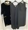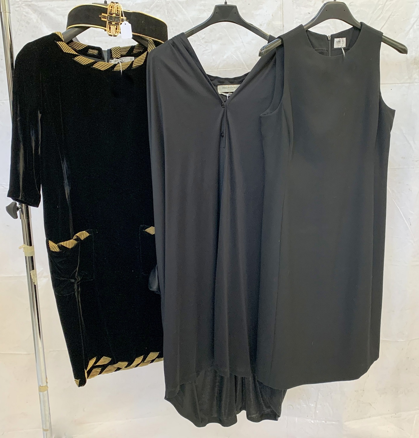 Lotto composto da un camicione in maglina di seta nero con cintura in camoscio nera e oro, la fibbia in smalti neri e strass, un vestito corto di linea dritta a mezza manica in velluto di seta nero, il girocollo, l'orlo e le tasche bordate da gros oro e nero e un vestito senza maniche in lanetta nero (tg. 42) (difetti e segni d'uso)