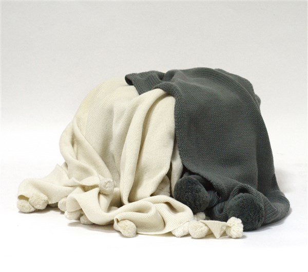 Lotto composto da una mantella di lana bianca e una sciarpa grigia, entrambe rifinite con pon pon (lievi difetti)