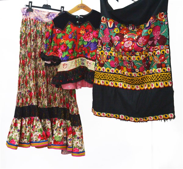 Dirndl d'epoca in lanetta composto da una lunga ed ampia gonna a fiorellini plissettata, un grembiule ricamato a fiori e un corpino a maniche corte en pendant rifinito con pizzo nero (tg. 40) (difetti e segni d'uso)