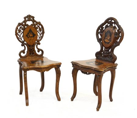 Due sedie in legno di forma sagomata con schienale a giorno intagliato a volute e stelle alpine e intarsiate a motivi di stambecchi, cervi e scena di montagna, misure diverse. Una con seduta apribile contenete carillon. Foresta Nera, inizio secolo XX (difetti)