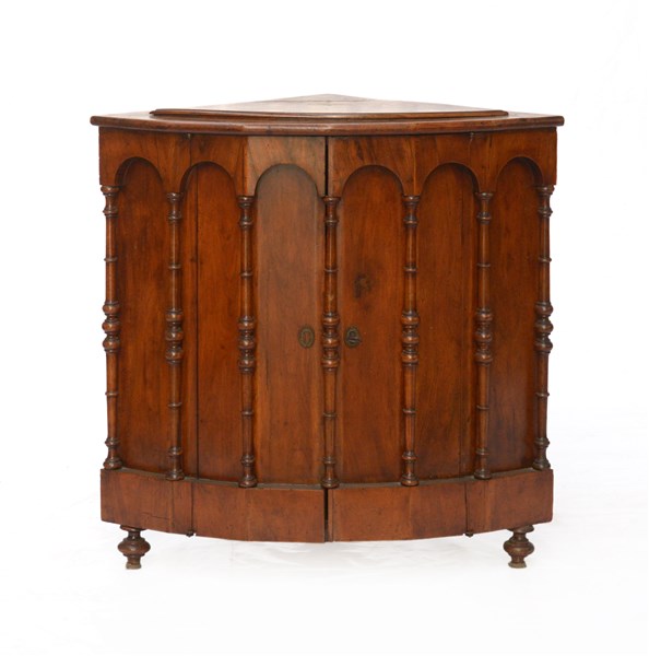 Angoliera con fronte curvo a due ante decorate da colonnine tornite, pianetto apribile, piedi torniti. Fine secolo XIX (cm 87x85x60) (difetti, restauri e mancanze)