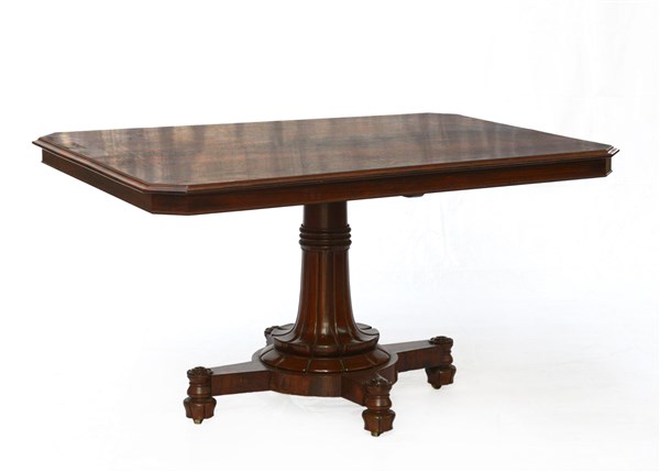Tavolo con piano a vela lastronato in palissandro, gamba centrale tornita e scanalata poggiante su base sagomata, decorata da rosoni intagliati, piedi muniti di rotelle. Secolo XIX (cm 137x75x98) (difetti e mancanze)