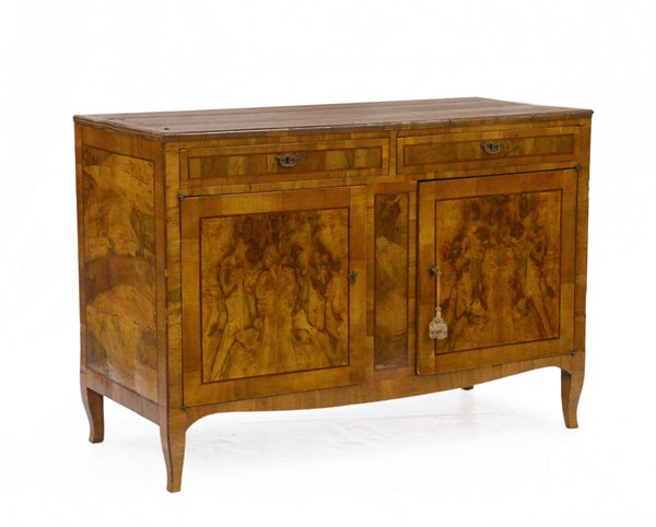 Credenza lastronata in noce e radica di noce e filettata, due cassetti e due sp