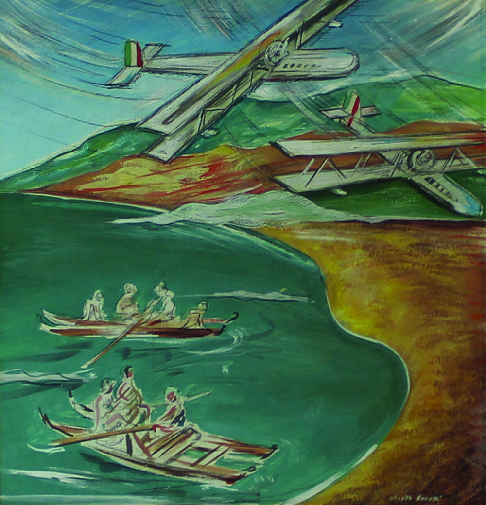 Bonetti Uberto Tra lago e mare (seconda metà anni' 30) tecnica mista su tavola cm 39x37 pubblicato su "Un futurista in Versilia" timbro comune di Vico Pisano Pisa al retro