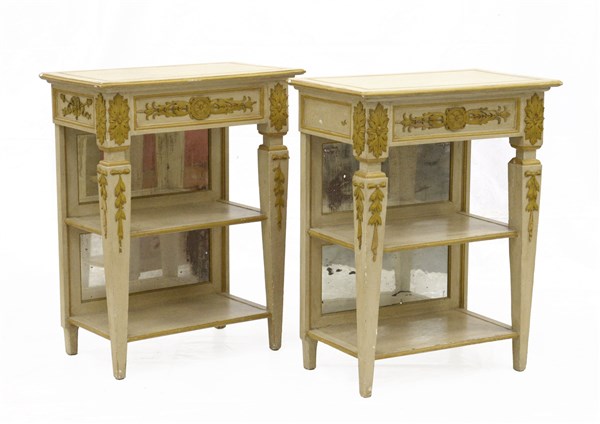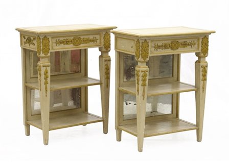 Coppia di étagère a tre ripiani in legno laccato e decorato da fregi in rilievo. Fondi a specchio (cm 73x92x43) (difetti)