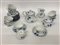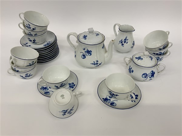 Manifattura Richard Ginori, servizio da tè in porcellana composto da dodici tazze con piattini, zuccheriera, lattiera e teiera, decoro floreale monocromo blu (difetti)