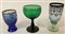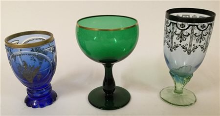 Lotto composto da tre bicchieri in vetro e cristallo di colori e forme diverse