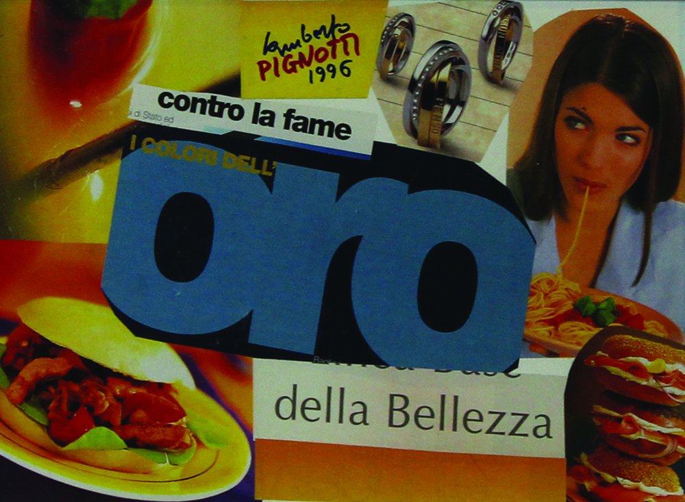 Pignotti Lamberto Contro la fame, 1996 collage su cartone telato cm 25x35 firmato e datato in alto al centro, autentica dell'artista su foto