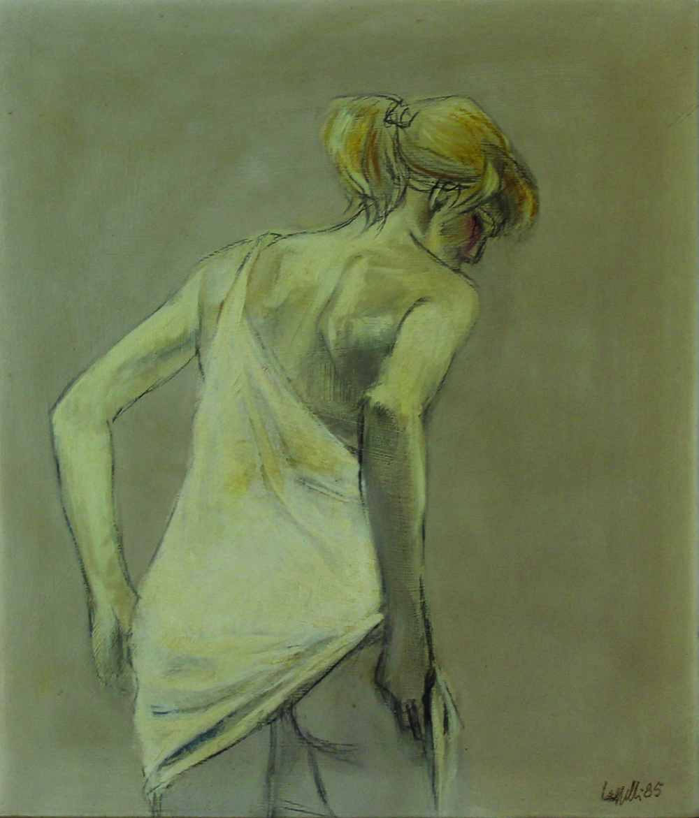 Cappelli Giovanni Studio di figura, 1985 tecnica mista su tela cm 60x50 firmata e datata in basso a destra, firmata, datata e intitolata al retro