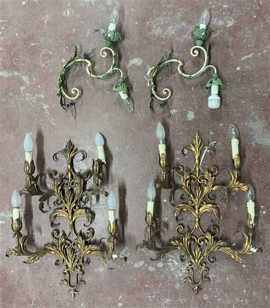 Lotto composto da una coppia di appliques a quattro luci ed una coppia a due luci in metallo dorato e laccato (difetti)