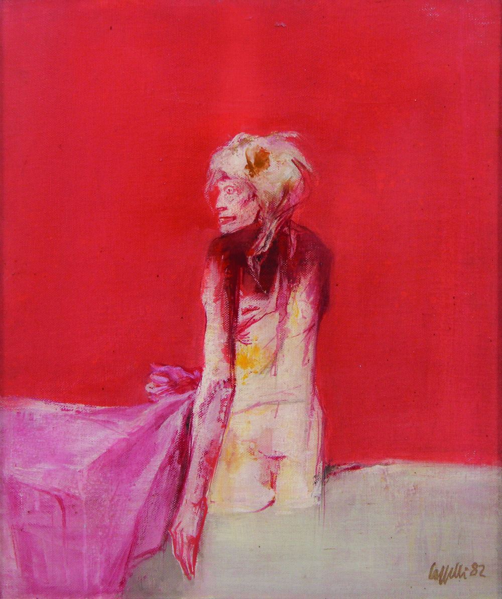Cappelli Giovanni Figura alienata, 1982 Olio su tela cm 50x40 firmato e datato in basso a destra, firmato intitolato e datato al retro, Etichetta Galleria d'arte Palmieri al retro, Timbro dogana di Ponte Chiasso al retro