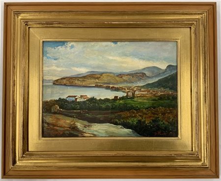 Firma indecifrata "Paesaggio lacustre" olio su tavola (cm 25x35) Firmato e datato in basso a destra. In cornice